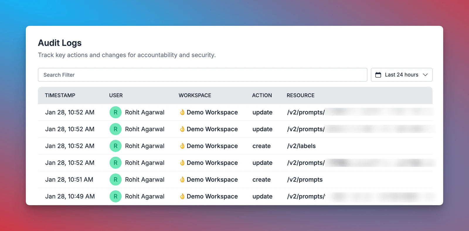 Portkey maintains detailed audit logs that capture all administrative activities across the platform. These logs provide visibility into actions related to prompts, configs, guardrails, integrations, providers, team management, organization updates, and API key modifications. Each log entry includes information about the user, the action performed, the affected resource, and a timestamp. This ensures traceability and accountability, helping teams monitor changes and investigate any unauthorized activity. Audit logs can be filtered by user, action type, resource, and time range, making it easy to track specific events. Organizations can use this data to enforce security policies, ensure compliance, and maintain operational integrity.